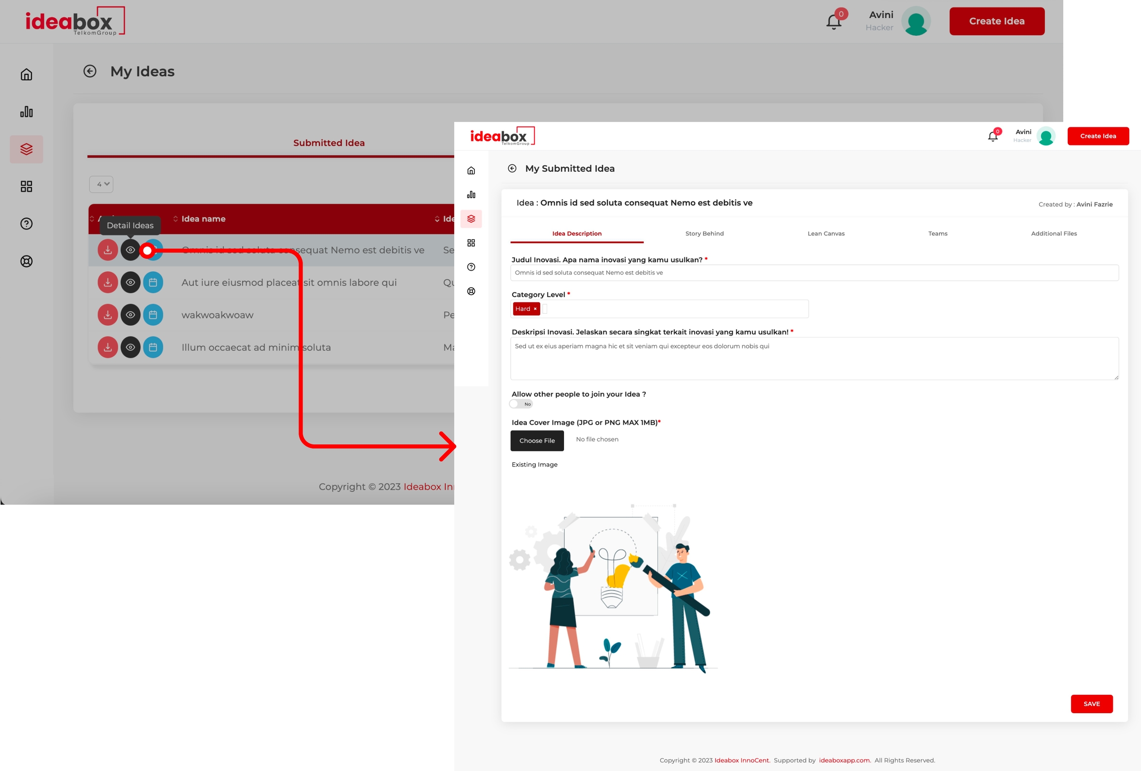 Setelah membuka page Submitted Idea atau My Action, klik icon "Detail Ideas" pada kolom Action