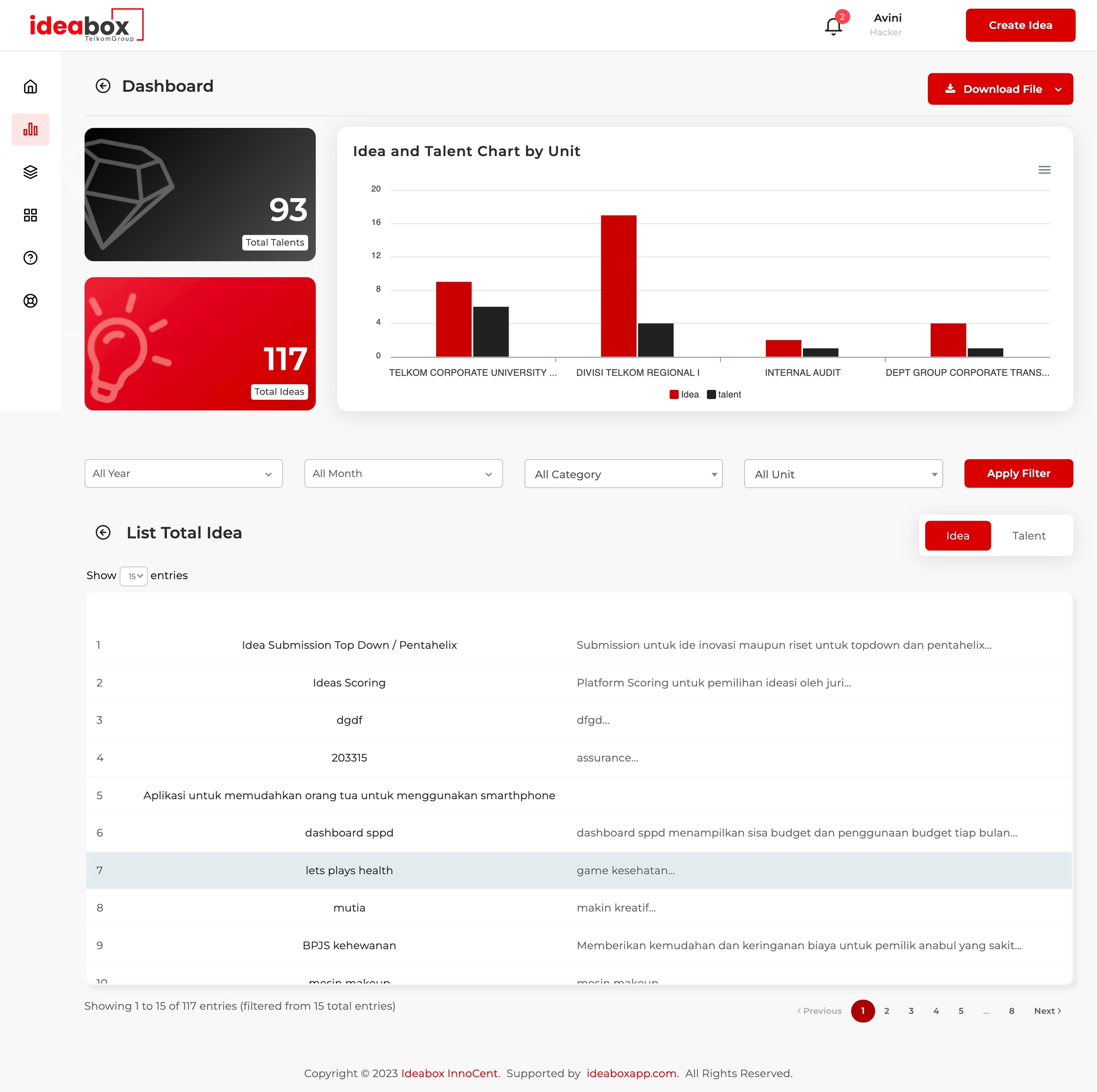 Data yang disajikan berupa total talent dan total ide pada Ideabox dalam bentuk chart berdasarkan unit. Dashboard juga menampilkan list berupa tabel dari total talent dan total ide.