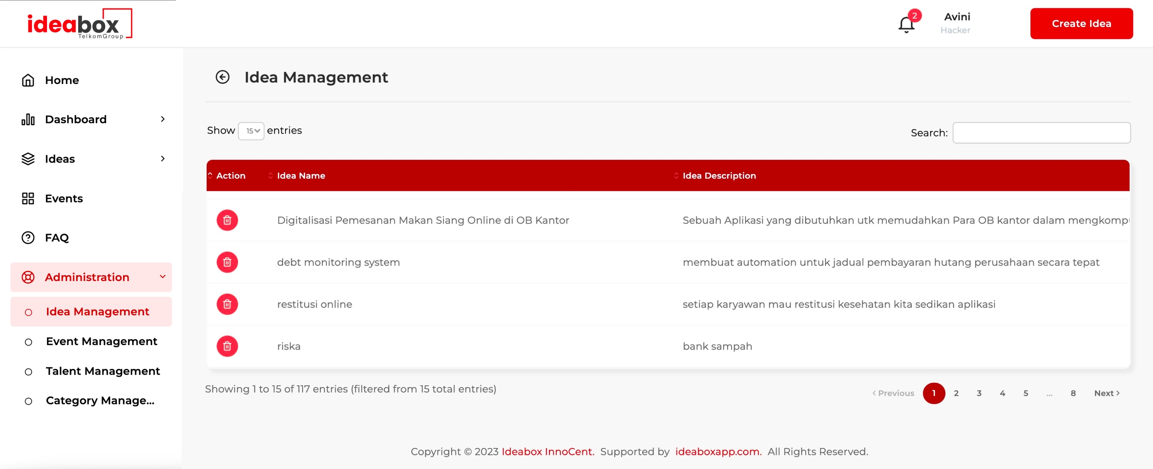 Idea Managament pada Ideabox merupakan kumpulan idea yang sudah disubmit oleh para innovator, disini kita para Innovation Manager bisa melihat dan menghapus idea milik innovator.